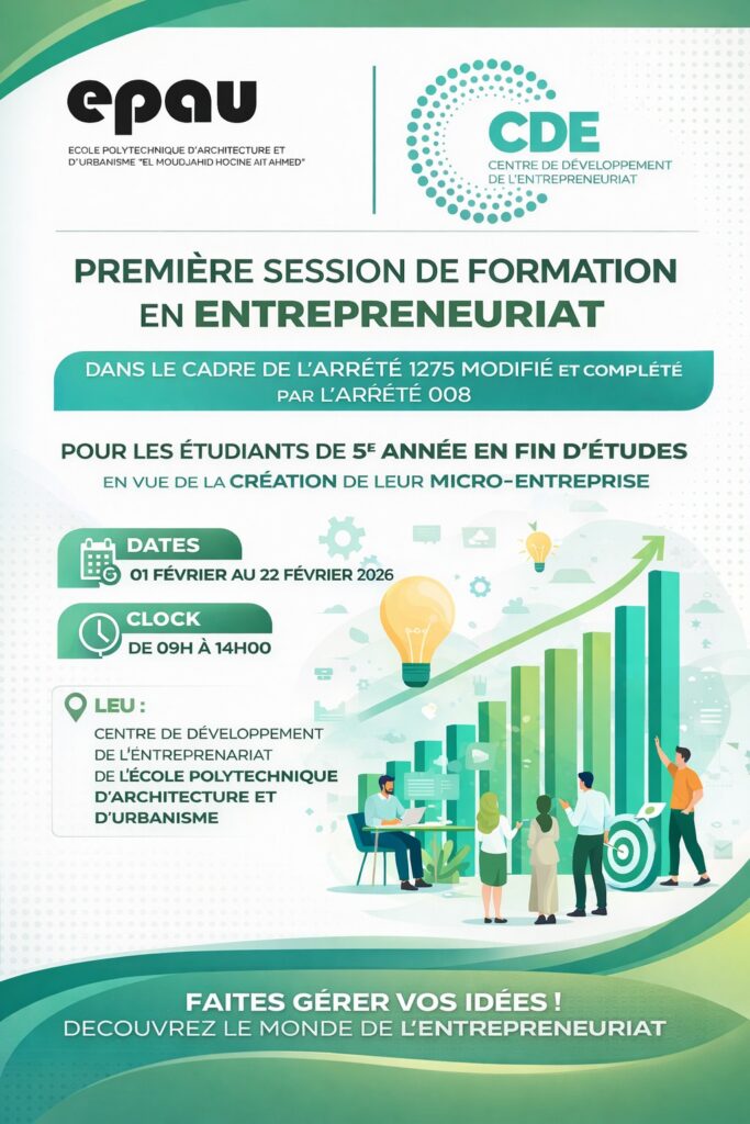 (CDE-EPAU) أن تُعلن عن إطلاق أول دورة تكوينية في إطار القرار رقم 1275 المعدل والمتمم بالقرار رقم 008، وذلك ابتداءً من 01 فيفري 2026. ستُؤمَّن هذه الدورة من طرف فريق تكوين مركز تطوير المقاولاتية بالمدرسة المتعددة العلوم للهندسة المعمارية والعمران (EPAU) و كذا ممثلة الوكالة الوطنية لدعم و تنمية المقاولاتية السيدة ملال حسينة، لفائدة طلبة السنة الخامسة، وتهدف إلى: تعزيز روح المبادرة والمقاولاتية لدى الطلبة، مرافقة حاملي الأفكار والمشاريع، تمكين الطلبة من اكتساب المعارف والمهارات اللازمة لإنشاء مؤسساتهم المصغرة. تندرج هذه الدورة في إطار دعم قابلية تشغيل خريجينا وتشجيعهم على ولوج عالم ريادة الأعمال وفق النصوص التنظيمية المعمول بها. على الطلبة المعنيين متابعة الإعلانات اللاحقة الخاصة بشروط وكيفيات الالتحاق والبرنامج التفصيلي للتكوين. بالتوفيق للجميع.